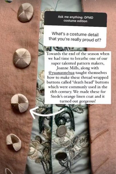 I wondered about the metal moths on Ed’s leather shoulder piece. Not because it seems historically accurate (I’m no expert on such things) but just to ask what you make of them, and are moths significant to pirates or anything else, fashion wise? I really like them. Also I really like Stede’s final, plain outfit, again not because of accuracy but because it symbolises the change in him, and promises a future toughening up, just as Ed’s various outfits highlight his emotional journey.