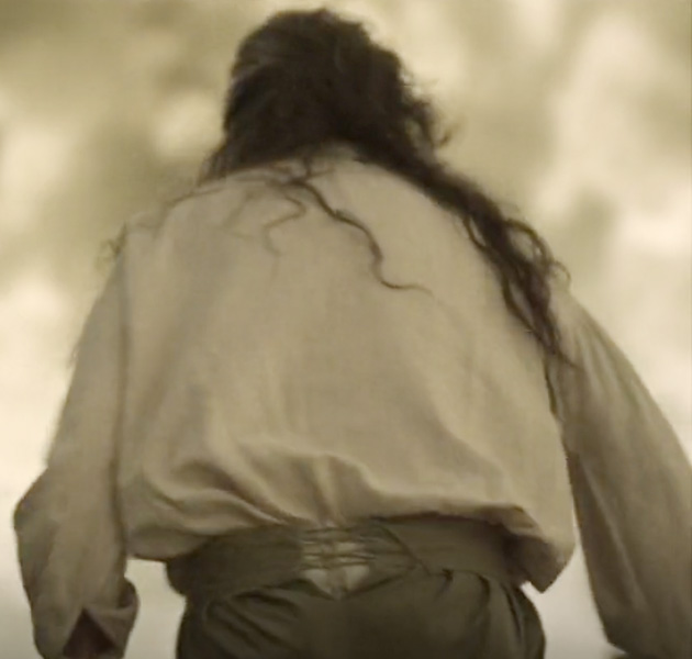 The last outfit we see Stede in is a plain and simple one, with black breeches, a very wide leather belt, and a somewhat less historical shirt. It’s got wider cuffs, a yoke, and a useless bit of renfaire lacing at the front. There’s a brief glimpse of a waist sash as he hauls his dinghy out to sea, and it also looks like he’s wearing boots with wide tops.
