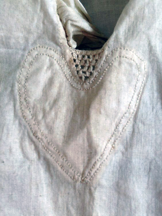 But the reason I really want more historical shirt slits is because of the little reinforcement patches. The slits down the front of the shirts are hemmed and need some sort of reinforcement at the bottom to keep them from ripping. Often it’s just some detached buttonhole stitch and a bar tack, but sometimes there’s a little heart-shaped piece of fabric sewn onto the inside!