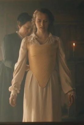 There are a couple dressing scenes, and I was delighted to see that they 1. put Diana in a corset (“pair of bodies” in this era), and 2. made a reproduction of an actual corset from this era!