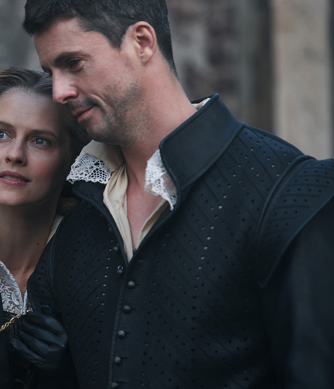 “The reason Matthew wears leather trousers, for instance, is because they are timeless. ‘That was an interesting design feature because I wanted it to feel correct for Elizabethan times. But I wanted it to not look out of place in current time.'”