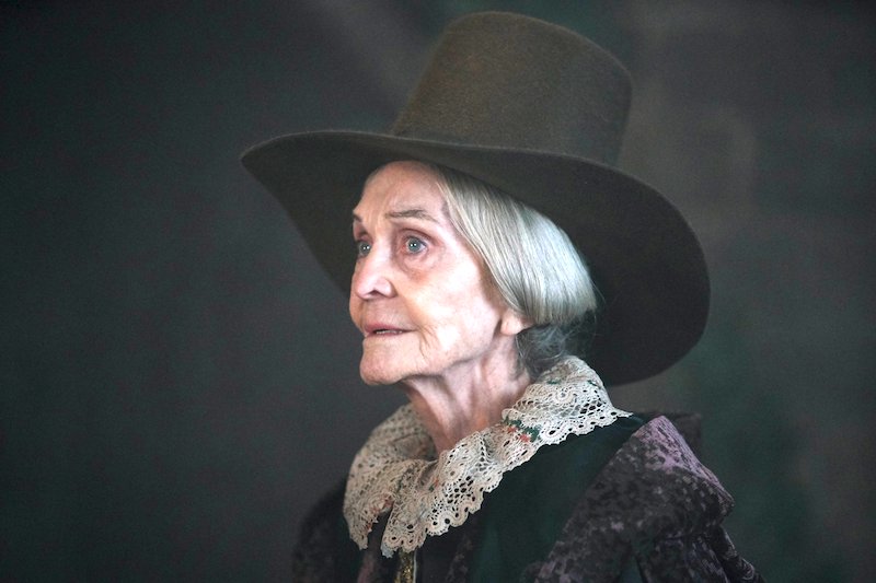 The last thing to mention are the costumes worn by the witches’ coven, all of whom are middle-class women. I really liked what they did — in particular, Goody Alsop (Sheila Hancock: The Buccaneers), with her tall crown hat: