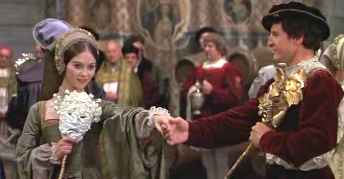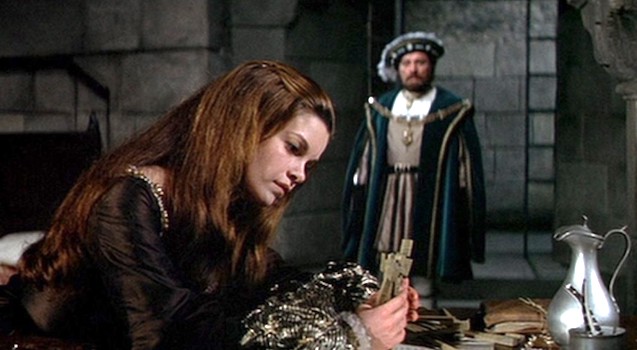 In this scene, Henry is dressed in garish green and red. Richard Burton is one of the more nuanced portrayals of Henry — he’s right on the edge of still being that Renaissance golden boy, but a little disappointed and needy, about to realize how he could become a cruel despot, just not quite yet.