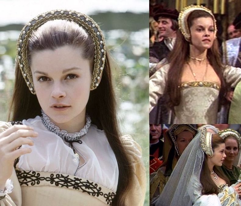 So let’s dig into that because my main beef with this film (as much as I love it) is the hair and headgear. Anne Boleyn is THE historical person known for the style we call a French hood, but she’s just not wearing historically accurate ones in this movie. As noted in my post The Real Deal on French Hoods in Film & TV, this flick commits three of the mortal onscreen sins against French hoods: 1) using headbands as French hoods, 2) letting hair flow loose with French hoods, and 3) sticky-uppy French hoods. Some of them all at the same time!