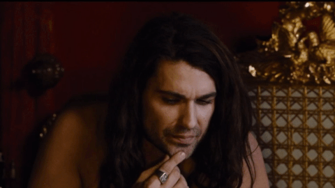 The theme for Paganini is “tortured artist.” At one point there’s a scene that full on reminded me of Michael Jackson’s face mask-wearing phase, but because of the annoying shaky-cam style filmography (WHY, BERNARD, WHY), I couldn’t get a screengrab of it. He slouches around and wears black a lot and apparently doesn’t believe in shaving his neck or brushing his hair. The overall effect isn’t sexy, it’s just skeezy.