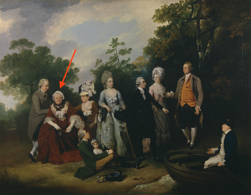 Also, the lace cap and ruffled lace around her neck are very à la mode for 1760s and earlier, and definitely seen on older ladies in the 1770s and 1780s.