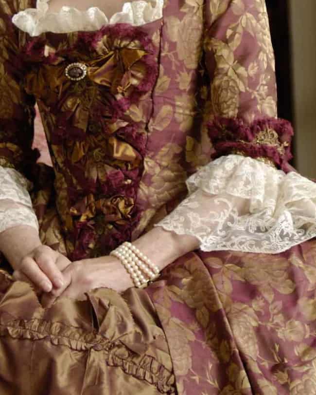 The main things to discuss in the Countess’s ensemble are the fabric and trimmings, since they got the classic cut and style of the dress right on. And here we go: I’m not sold on the fabric, guys! Okay, there’s nothing offensive about it, it’s fine — it’s got a woven floral pattern that’s naturalistic, which is typical of the 18th century. But while of course you can find all kinds of colors in any era, this particular burgundy and tan just reads as (modern) furnishing fabric to me, and doesn’t speak to the 18th century aesthetic — which no, was not all light-colored florals; in the first half of the 18th century, dark colors and heavy patterns were indeed fashionable.
