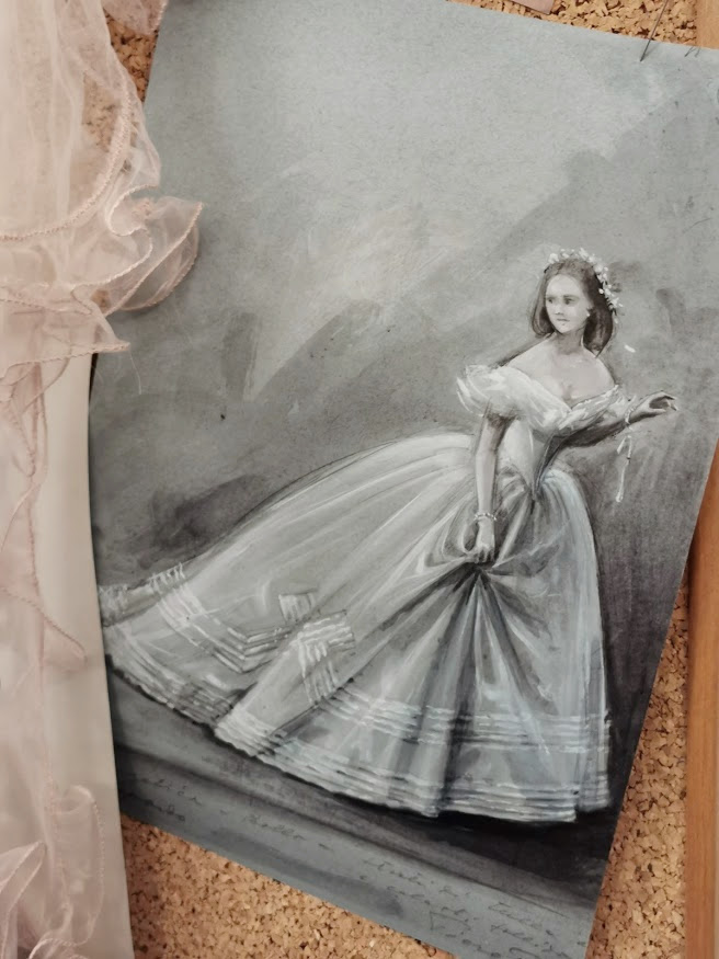Ice Fairy or Snow Queen, you decide! The bell shape of the skirt rather than the later very wide cage crinoline, as well as the low and wide neckline are perfect for the period. It’s a dress of ethereal, delicate beauty, full of romance yet escaping the “wedding cake” look.