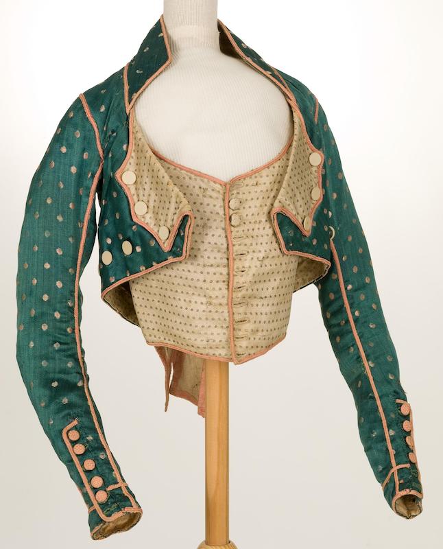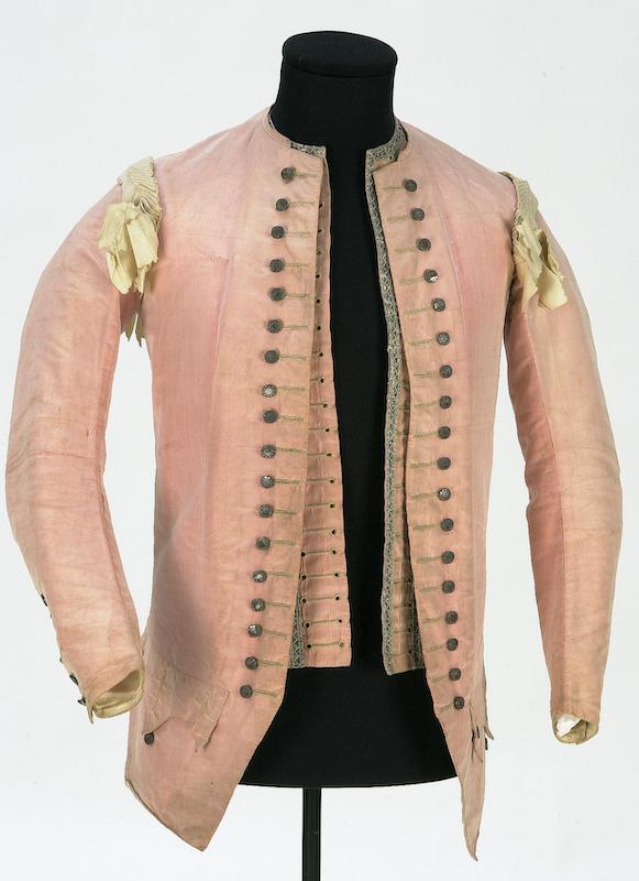 - Menswear-inspired jackets, often with revers (turnbacks), buttons, and cutaway front revealing a waistcoat: