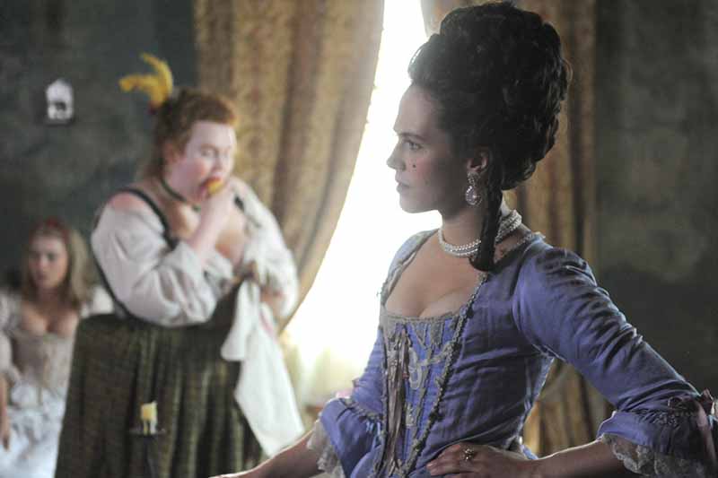 As I was updating our list of upcoming historical costume movies and TV series for the new year, I noticed a show called Harlots, described as “Brothel owner, Margaret Wells, struggles to raise her daughters in London during the 18th century.” Now doesn’t that sound fun? But looking on IMDB, the source of all truth, I couldn’t find any photos and very little news aside from the premiere date — March 29, 2017, on Hulu (note to self: get Hulu). Also, I saw that the costume designer was Edward K. Gibbon, and his resume includes the awful, prom-dress-infested 2016 War & Peace. Dammit, I needed pictures, I needed to see if this “Harlots” show was going to suck.