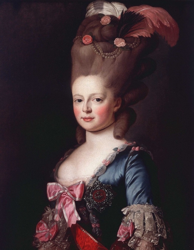 I liked this style for showing her youth and freshness, and because they got the key element of hairstyling in the second half of the 18th century: for both men and women, the front was up to the crown of the head, but the back was longer.