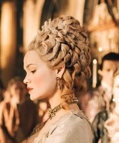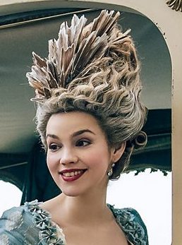 She goes back and forth between these two looks during her time as dauphine; here’s another more-accurate-to-the-specific-period look that again is all curls in the back (although the hanging ringlet helps). The other annoying thing is that in this period of the show, they’re trying to hammer home the point that Versailles is ALL FORMAL ETIQUETTE — although they talk about it more than show it. One great way they could have shown it was through hair powder, but there’s almost none throughout the series.