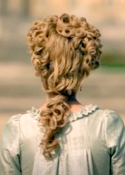 That being said, even this style isn’t quite right for the era. What should she be wearing? The “tête de mouton” or sheep’s head style, which involves lots of regular curls across the front half of the face, and the back pulled up smoothly.