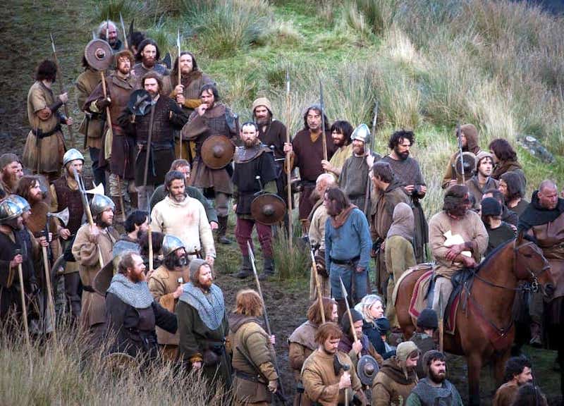 Based on the pictures provided, I’m seeing the “Burlap Syndrome”. I can recognize that the boots Chris Pine is wearing are from Armstreet armory in the Viking Collection. I can also see arming caps and biggin’s being worn in the crowd scene. Also noticed the historically inaccurate leather ring belt. That staple of the Ren Faire world.