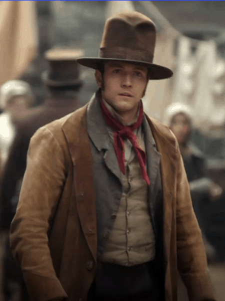Again, I comment on how adorable, happy, and correct the young Parkers look. Her hat is perfect — none of the weird, sheer hat brims flopping around. She has curls at the front of her hair and a perfectly high-waisted ensemble. Details to note — puffed sleeve at the shoulder with a very close-fitted arm to the wrist. I will ignore the gloves and say the fan is a nice detail. He is wearing his regular jacket, proper layers, and pants in the right color. These two actors have such joy that their scenes are the funniest and best. Plus in this short scene, we see Charlotte’s hair up!