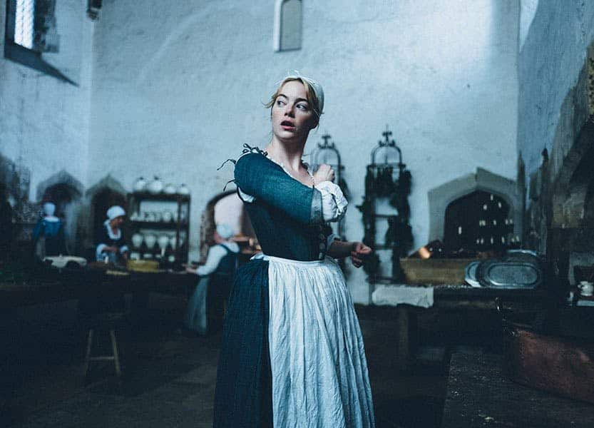 Abigail, a character played by Emma Stone, begins her court career at the humblest level: as a servant in the kitchen. She’s wearing a dark-blue dress, like all the other kitchen staff, made of denim. “I wanted it to look like they were wearing workwear,” said Powell. “I used jeans that we bought from thrift stores and cut those up and turned them into the bodices and the men’s waistcoats of the kitchen staff, and the skirts.”