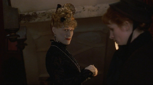 In that regard, I enjoyed Mary Reilly for playing around in the shadows of the human mind and I thought that the costumes by Consolata Boyle helped reinforce the rigidity projected outwardly by nearly all the characters (even the unhinged Mr. Hyde) while making it clear that the dark fantasies were barely kept in check. Dark colors with splashes of blood red abound, from the slash of garish anachronistic red of Mrs. Farraday’s lipstick (played with juicy enjoyment by Frears’ alum Glenn Close, who has never met a camp role she didn’t absolutely dive head first into), to the shocking tumble of red curls barely kept in check under Mary Reilly’s prim white cap. Boyle’s designs for the characters underscore each one’s diverse array of personal traumas, held together by a tightly fitted waistcoat or a heavily boned corset.