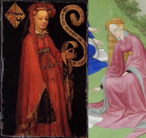 I don’t like the back of the red houppelande- there’s no basis for that that I know of, and frankly, once you remove the belt, you can easily slip it on and off. No need for a laced back opening.