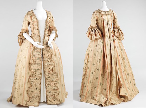 They were clearly inspired by this surviving robe à la française at the Victoria & Albert Museum. This gown is from the late 1770s according to the museum (with alterations done in the early 19th century). This bodice style is more typical of the 1780s, when the style was to have a bodice that closed entirely in front. This dress is also missing whatever originally trimmed the sleeves.