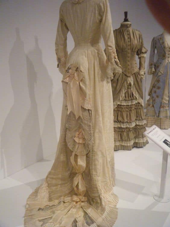 For most of the bustle era, a woman would wear some kind of bustle foundation, which could range from a soft pad to a wired structure (& there were TONS of different designs & shapes!). The exact size of that foundation would vary according to the woman’s own proportions, taste, social status, & the fashion of the year. Take a look at those silhouettes at the very top of this post — no human woman could have a backside shaped like the early bustle or late bustle eras; that’s all created with a foundation garment :)