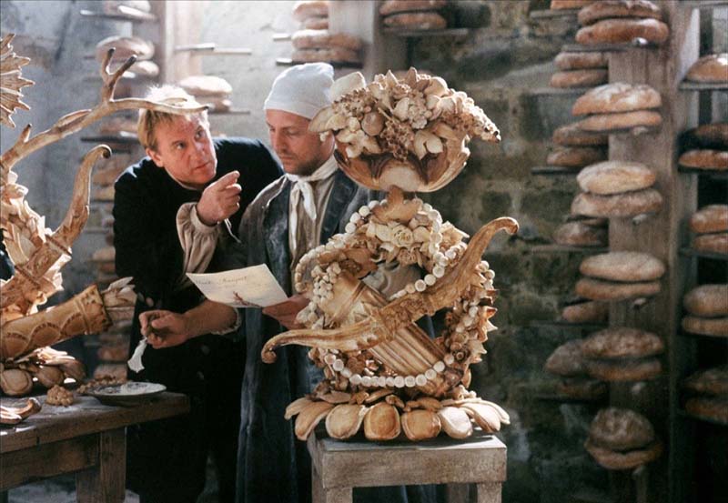Being the story of a chef, the food plays as big a role as the costumes. Vatel is an artist in sugar paste and ice and bread, and he creates a new fantasy spectacle for the court each day that combines music, visuals, and tastes unlike anything this jaded audience has seen. He also makes exquisite, ephemeral food creations as lover’s gifts. The film shows all of this gloriously, and the colors play beautifully between the food, sets, and costumes. Even if the movie’s story doesn’t engage you, it’s really delicious to look at.