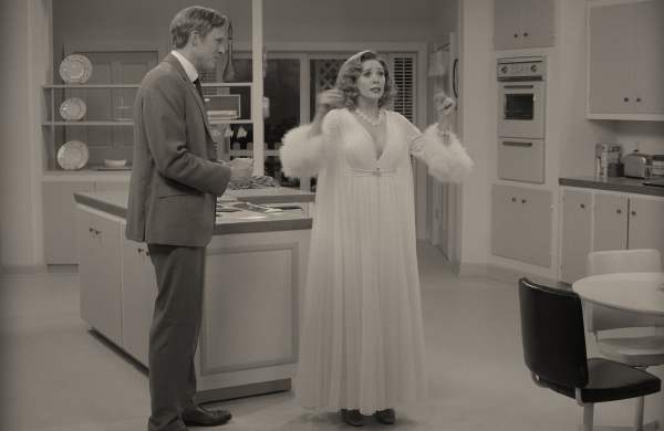 If you didn’t know any of this, and you dropped into WandaVision, you’re going to be pretty confused. For those of us who do know it, it’s still confusing considering Vision is “dead” (or, at least destroyed, but who knows when you’re dealing with an android), and obviously it makes no sense that the undead Vision is hanging out in a black-and-white world with his living girlfriend, cracking jokes to a disembodied laugh track (though in reality, the first two episodes were filmed in front of a live audience, believe it or not).
